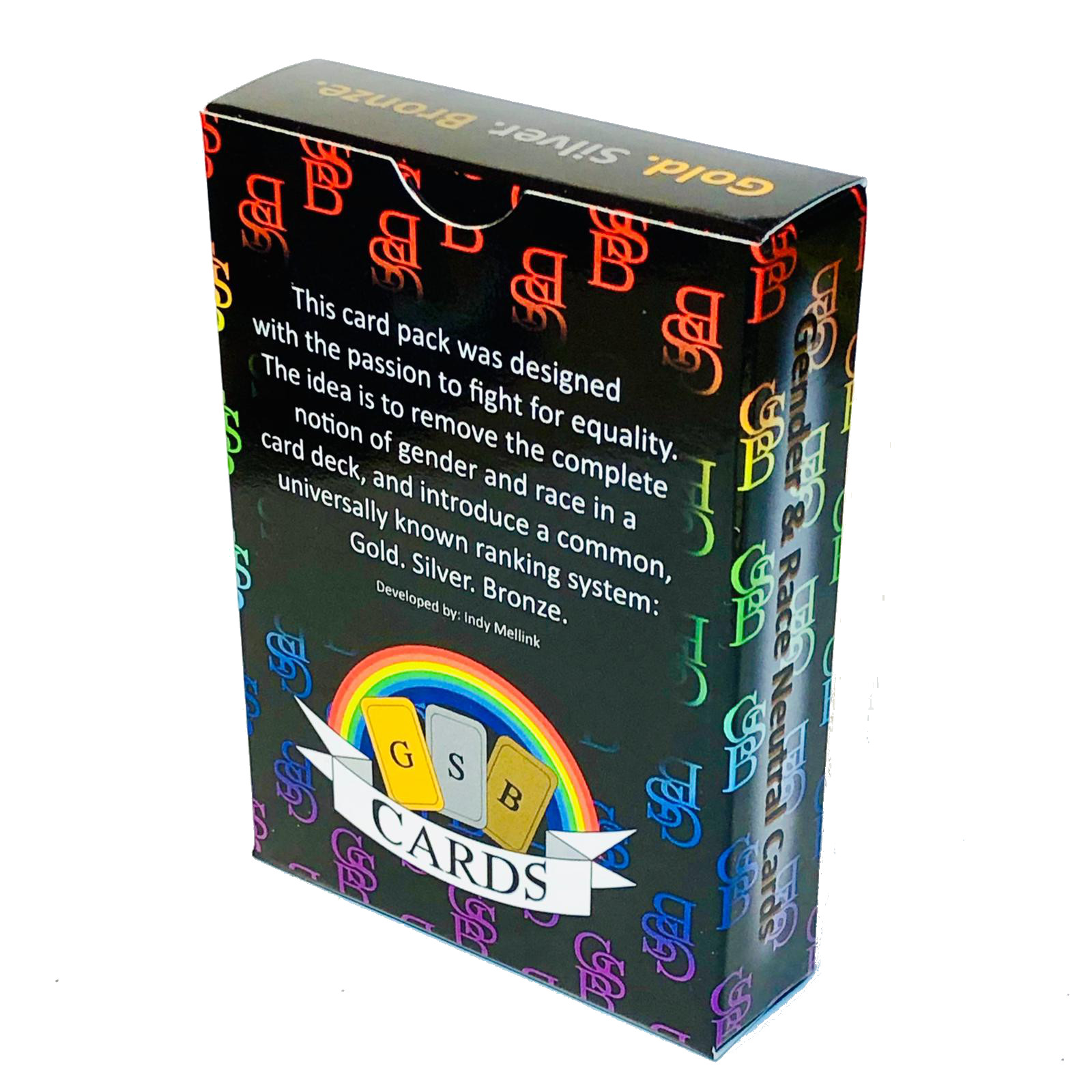 GSB signifies Gold, Silver and Bronze. The idea is to remove gender hierarchy and race differences from our card decks by replacing the King, Queen and Jack by Gold, Silver and Bronze, the medals and ranking order known from the Olympics. Now you can choose to play with a gender-neutral deck of playing cards. These cards also eliminate skin color by replacing human figures with medals known from sports, providing not only a gender-neutral but also a race-neutral card deck.